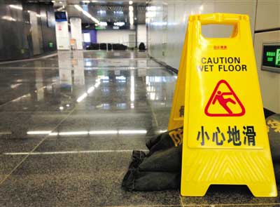 昨日中午,在该地铁站地下二层南侧靠近卫生间的站台上方,天花板上仍有五六处在滴水,下方摆放有“小心地滑”的警示牌。